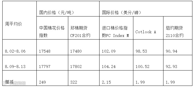 上周(8月9日-13日),美国农业部下调2021/22年度全球棉花产量和期末库存,国内外棉价均有所上涨,国际棉花涨幅高于国内,内外棉价差缩小。上周中国棉花价格指数(CC Index 3128B)周均价为17797元/吨,环比上涨249元;Cotlook A指数周均价为100.52美分/磅,环比上涨1.99美分,1%关税下折人民币16018元/吨,较中国棉花价格指数(CC Index 3128B)低1779元,价差较前一周缩小65元;郑州期货主力合约CF201周均价17802元/吨,环比上涨322元;ICE棉花期货近期合约周均价为92.93美分/磅,环比上涨1.99美分。