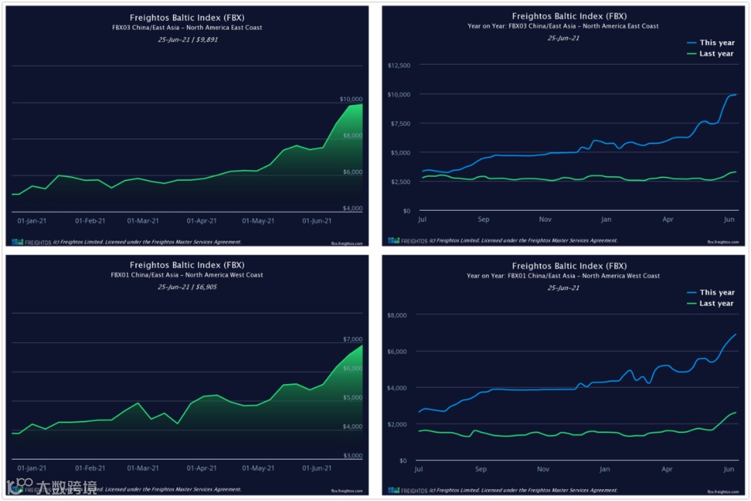 而美国西海岸的FBX指数为6905美元、美国东海岸的FBX指数为9891美元。