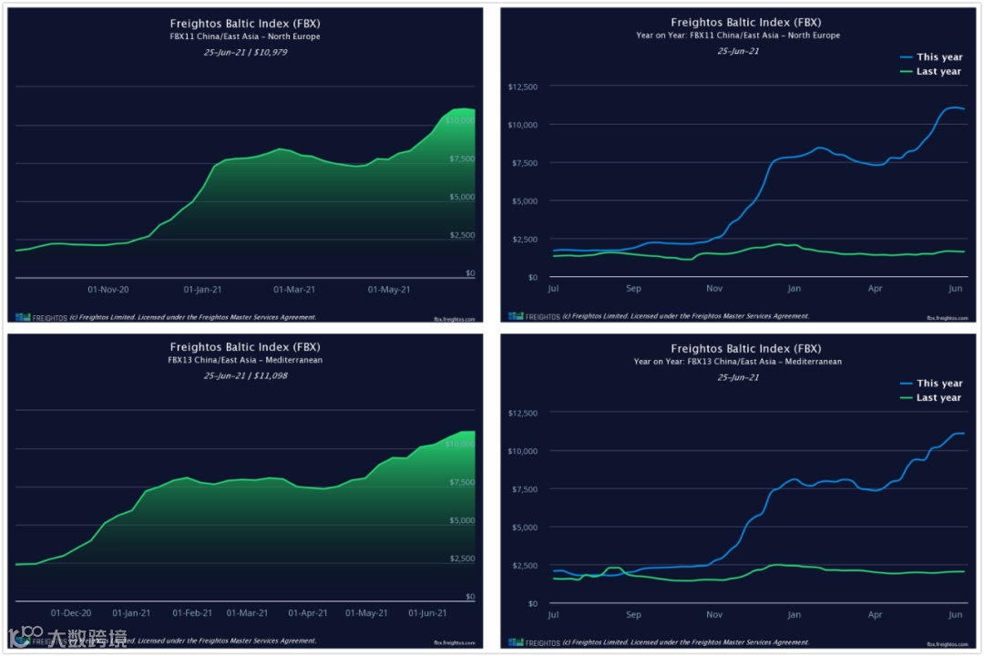 最近一周波罗的海航运交易所与Freightos推出的全球集装箱货运指数(Freightos Baltic Index)显示北欧运价指数为每40英尺10979美元、地中海运价指数为11098美元;