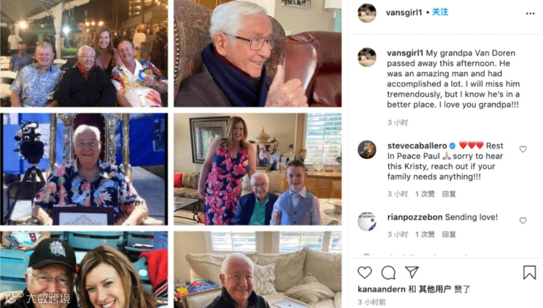 “我的爷爷 Vans Doren 今天下午过世了。他是一个了不起的人,并取得了很多成就。我会非常想念他的,我知道他去往的是一个更好的地方,我爱你爷爷!”