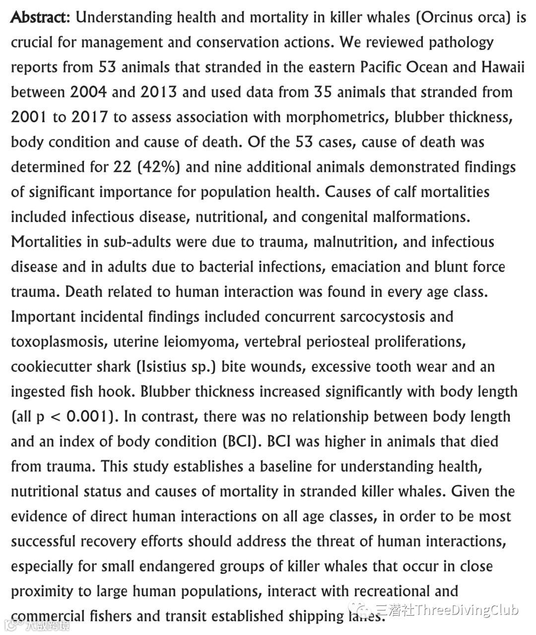 谁是真正的杀手?虎鲸死于钝伤,而不是感染,“对于灾难性的创伤,我们预计动物会急性死亡;然而,由于感染、肿瘤或食物意外事件,与热量摄入不足有关的身体状况的丧失可能导致BCI的下降,”Raverty解释说。
