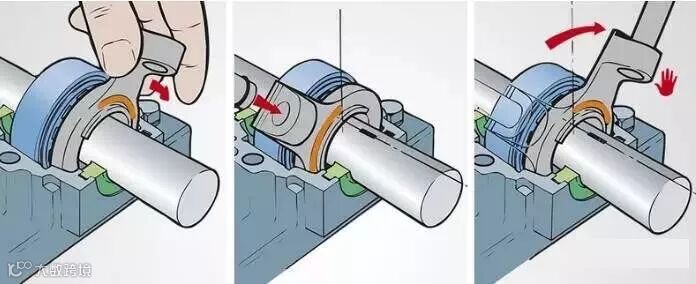 安装时对轴承施加的作用力,绝不可通过滚动体从一个轴承圈传递到另一个轴承圈,否则可能会对滚道造成损坏。但在任何情况下,都不可以直接敲击轴承圈、保持架、滚动体或密封件。