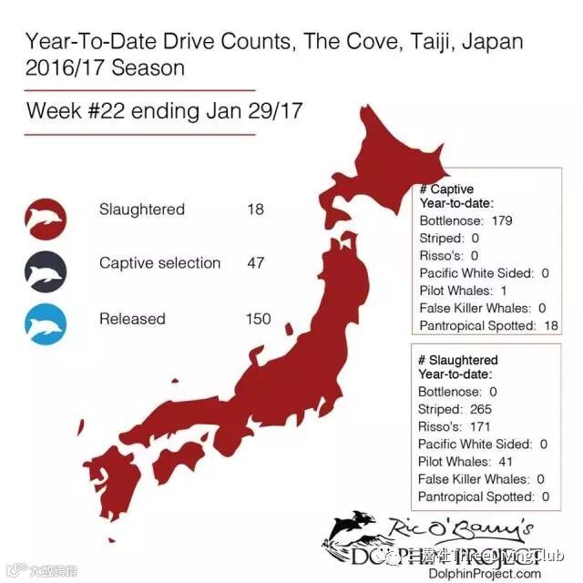 从Dolphin Project每周更新的数据上看到,太地町从2016年年底至2017年1月底, 22周内已经大规模捕捉47个宽吻海豚,也屠杀了大量的灰海豚。