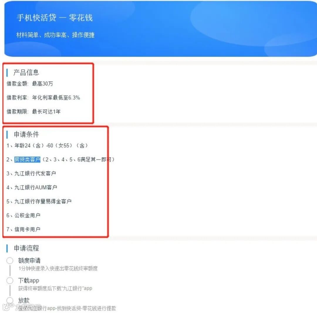 其中,产品利率从海报宣传的“4.9%”变成了“年化利率最低至6.3%”,申请条件从“22周岁及以上;连续工作时间不少于12个月;情侣一方需为行政事业单位正式员工”,变成了“1. 年龄24(含)-60(女55)(含);2. 九江银行房贷类客户(2、3、4、5、6满足其一即可);3. 九江银行代发客户;4. 九江银行AUM客户;5. 九江银行存量易得金客户;6. 公积金客户;7. 信用卡用户。”