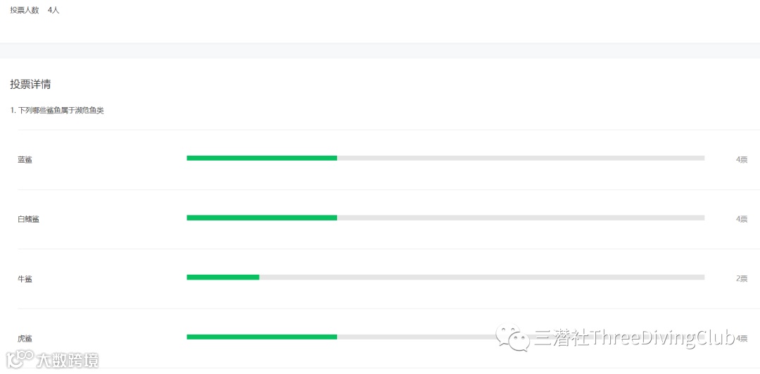 说明:选项共四个,蓝鲨、白鳍鲨、牛鲨、虎鲨,其中仅白鳍鲨是濒危动物,而且是极危动物,另外三个是无危状态。此题共四人回答,全部选了白鳍鲨,但同时都至少选了第两个,所以回答正确的是没有。