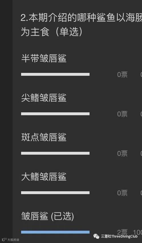 自新年过后,我们开始了鲨鱼物语的连载,第一个真鲨目用了四期进行讲解,其中不乏细节的区分,易混淆的说明,濒危情况等,每次章节结束前我们都会有两道题目,一是作为阅读知识的巩固,二是为了答谢新老粉丝发放奖品。