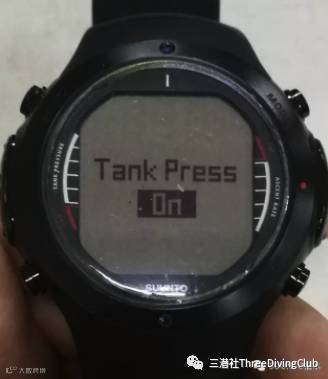 将潜水电脑移至传感器附近,进入潜水模式,按住DOWN两秒,进入潜水设置。上下滑动选择“Tank Press Pairing”,选择“On”。