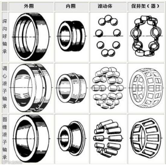 滚动轴承中常用的是深沟球轴承、圆柱滚子轴承和推力球轴承。其中滚动轴承已经标准化、系列化,一般由外圈、内圈、滚动体和保持架四部分组成。