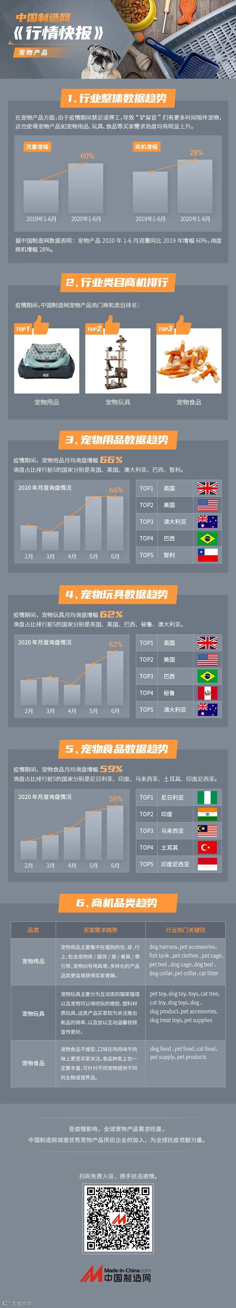 中国制造网(Made-in-China.com)数据显示,宠物产品2020年1-6月流量较2019年同期增长60%,询盘商机增长28%。