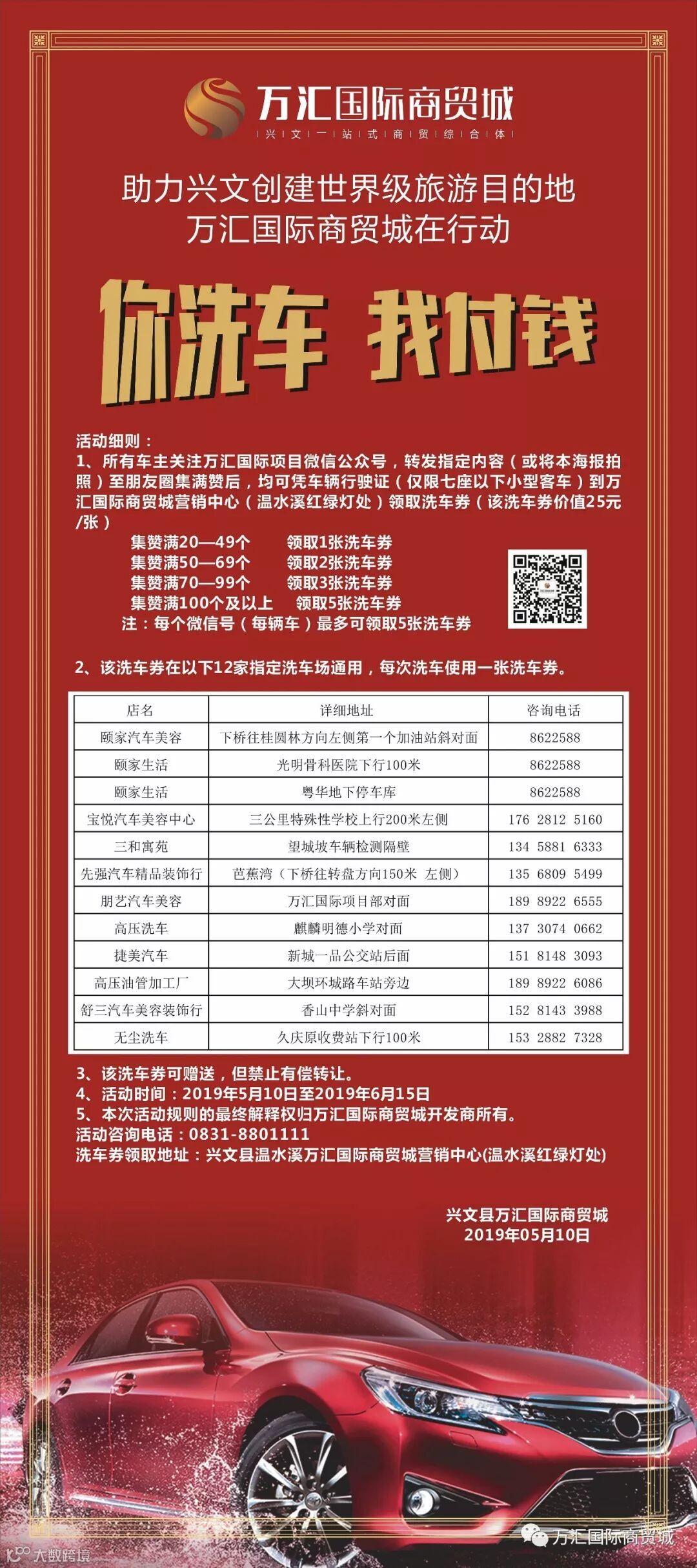 万汇国际为广大车主提供500张免费洗车劵