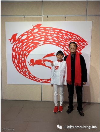 从此潜水让我爱上了大海,在2019年的上海小囡剪纸展,我用意训堂老师们教的本领,做了一幅海派文化剪纸作品“潜水”我和大海里的鱼群,我的灵感来自于墨宝潜水时的沙丁鱼鱼群。这幅作品得到了大师朱立群老师的赞赏。