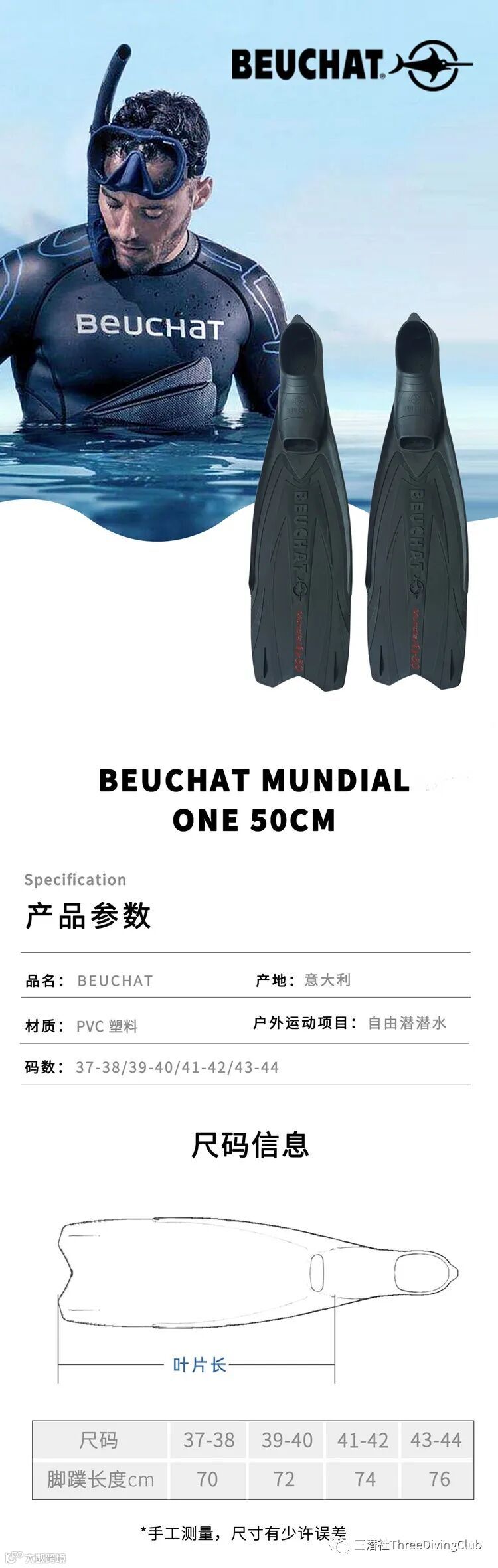 善于洞悉痛点的Beuchat再接再厉,推出了Mundial One-50,将叶片长度调整至50cm,使整个脚蹼的长度控制在70-76,如此,自由潜的姑娘们和小伙子们可以把脚蹼放在行李箱里托运了!