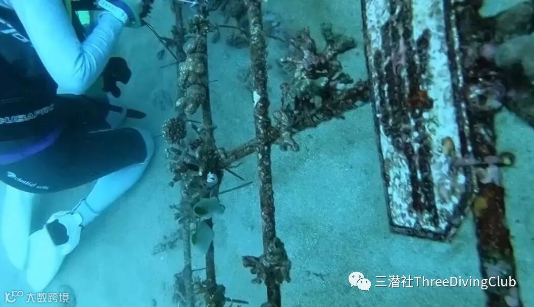 将健康珊瑚绑在人工礁石上,大片为已根植的珊瑚