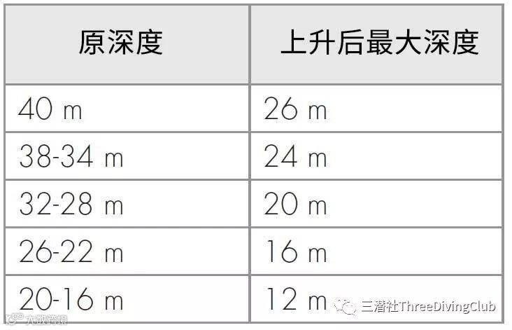 1、多层深度的潜水应该遵照每次的深度浅于上一个深度(对于多次重复潜水我们也应该遵循这个原则),且需遵守以下表格的变化要求,比如下潜后一开始在35米潜水,在上升到20米后才能算作做了一次深度变化,21米则不算。