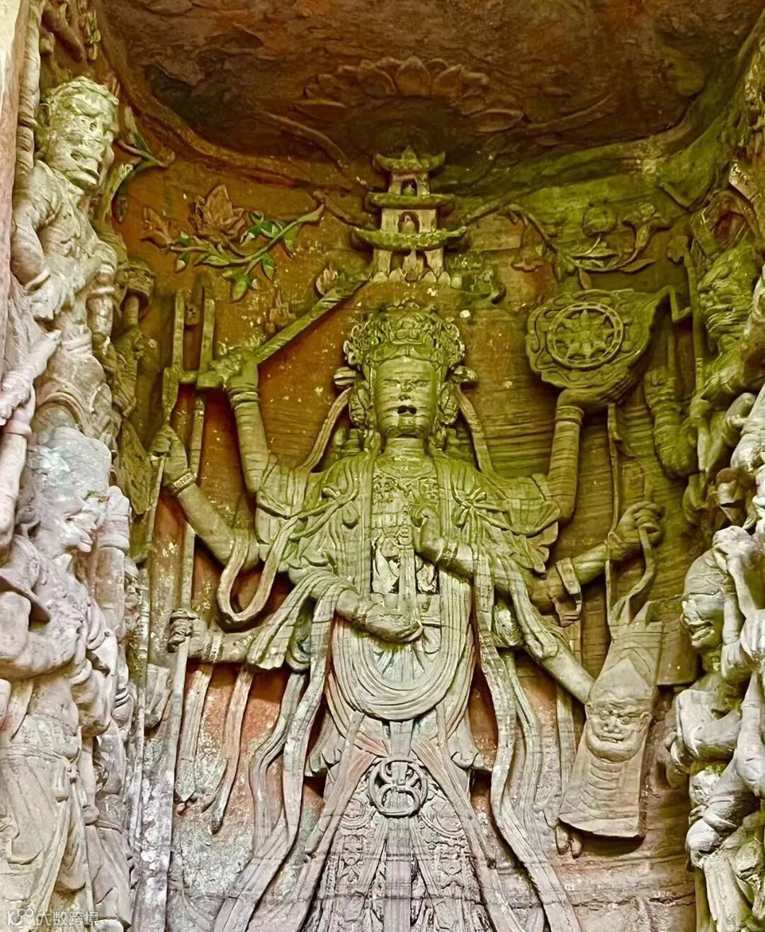 大足北山石刻摩利支天作天女形象,属忿怒相头戴宝冠,身饰缨珞,彩带飘拂,脚踏战车,三头八臂,各执剑、戟、弓、盾等兵器,怒目圆睁,舌绽春雷,威风凛凛。战车前有二象挽辕八位金刚力士侍立左右,造型夸张,横眉怒目粗犷剽悍,给人以强烈的视觉冲击力。
