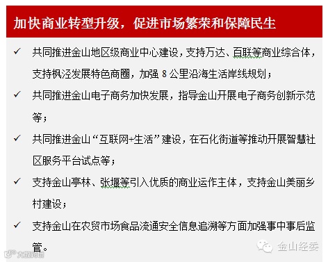 3月1日上午,市商务委与金山区签订《共同推进金山商务发展战略合作协议》,通过市商务委与金山区紧密合作,努力将金山打造成具有产业特色的上海国际贸易中心和科技创新中心的重要功能承载区;双方在商务领域加强全面合作;加快重点产业招商引资和对外贸易发展方式转变;大力推进商务领域创业创新和示范试点。