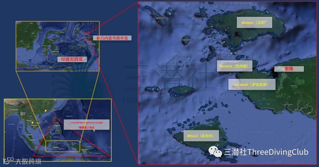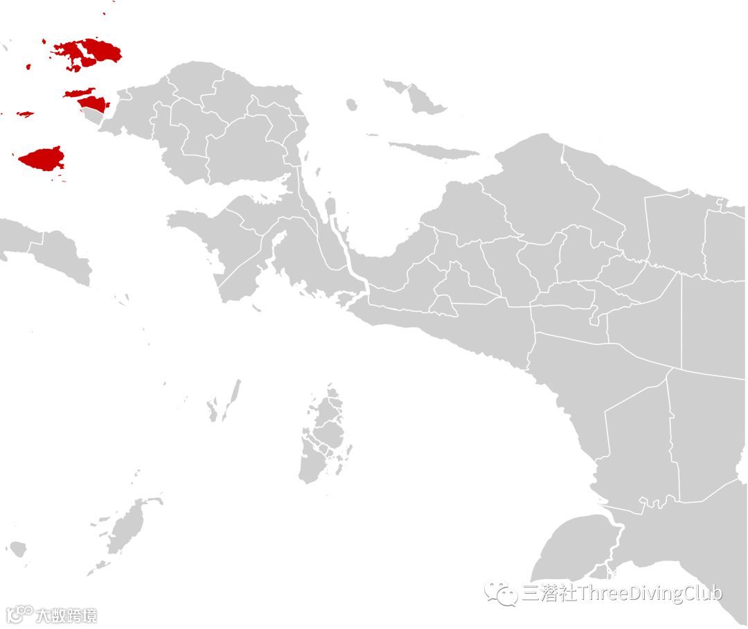 四王位于印尼新几内亚鸟首半岛(Bird's Head Peninsula)西北部,由 1500 多个小岛屿、珊瑚礁和浅滩以及 4 个王子岛:Misool(米苏尔)、Salawati( 萨拉 瓦蒂)、Batanta(巴丹塔) 和 Waigeo(卫古) 组成 ,整个海域面积近4万平方公里。