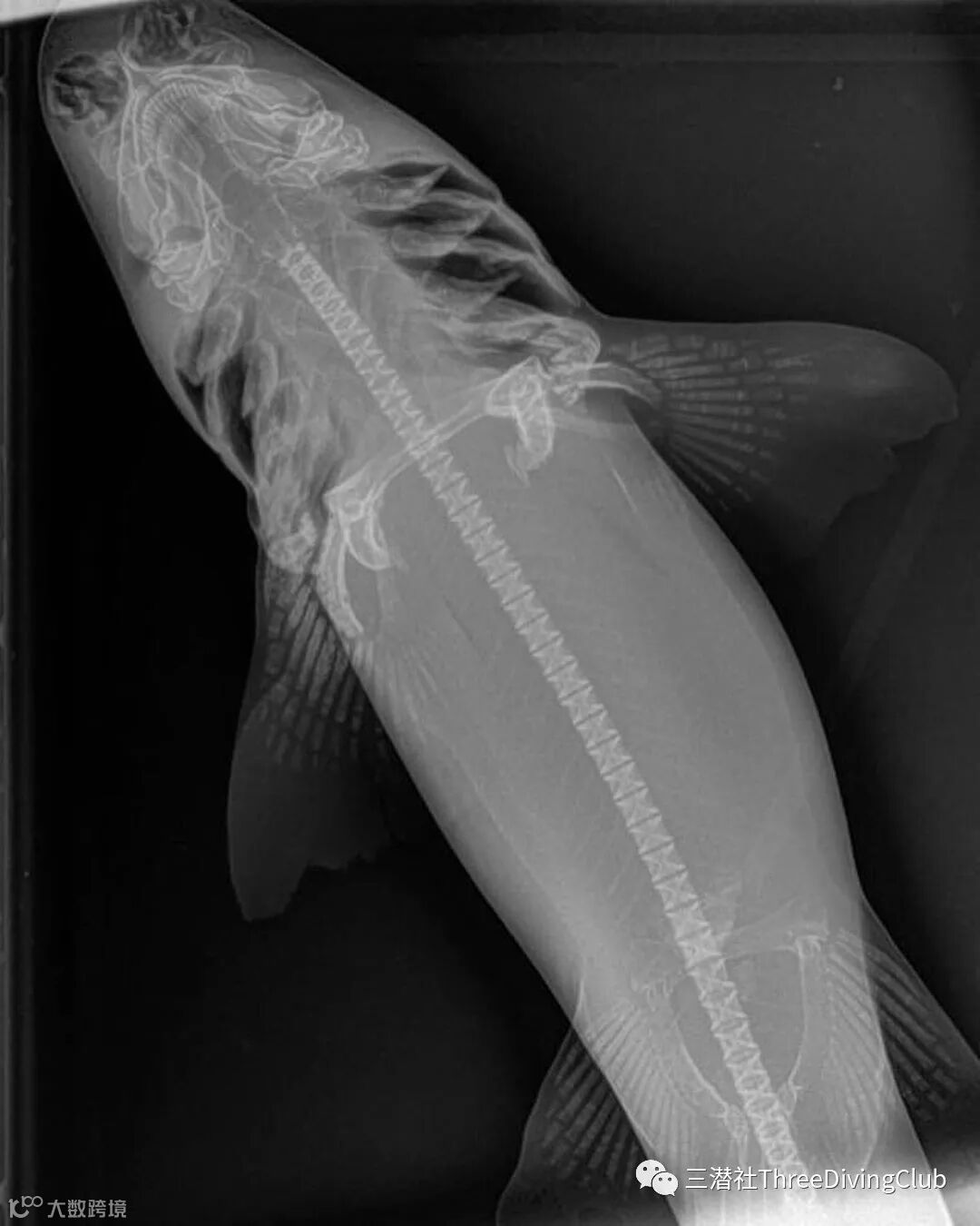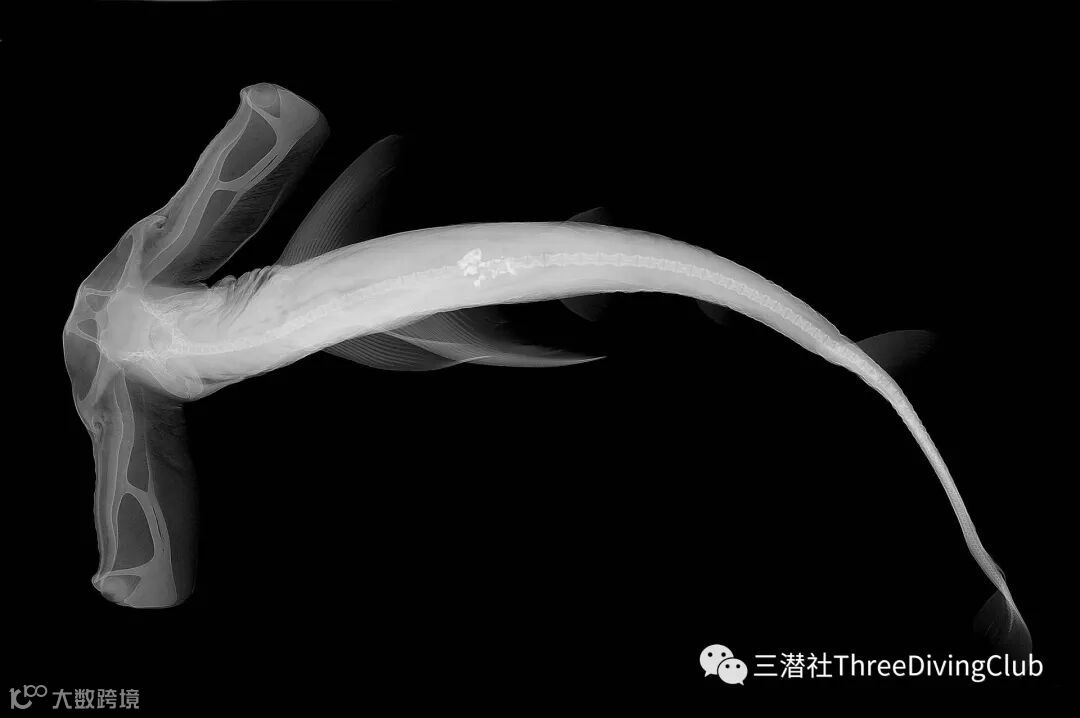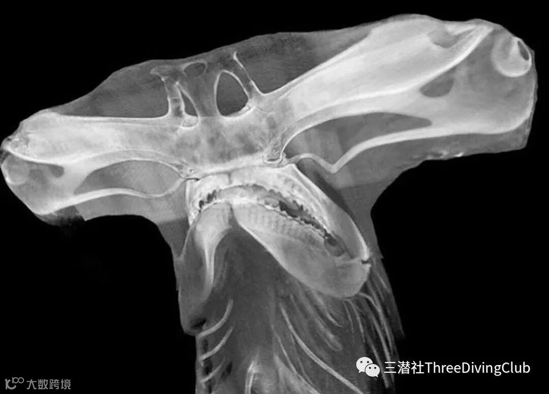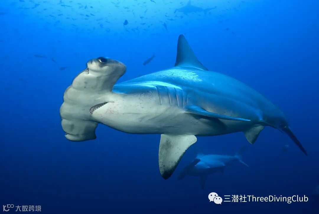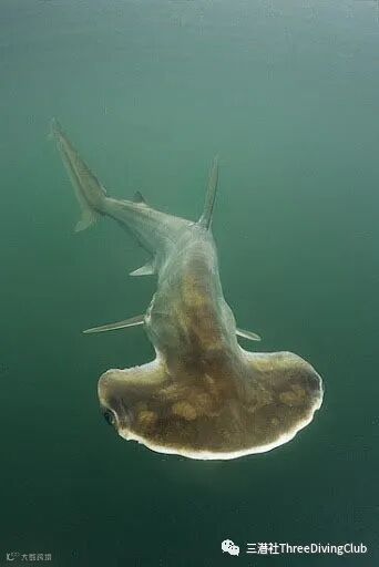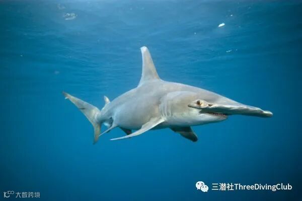无沟双髻鲨(Sphyrna mokarran),这个是锤头里的大哥,最大可以长到6米,头翼也大,背鳍也大,它们喜欢吃刺魟,日本有分布,班达海可以见到。不过物种属于极危状态,每一头都是珍宝。
