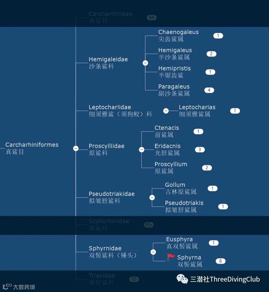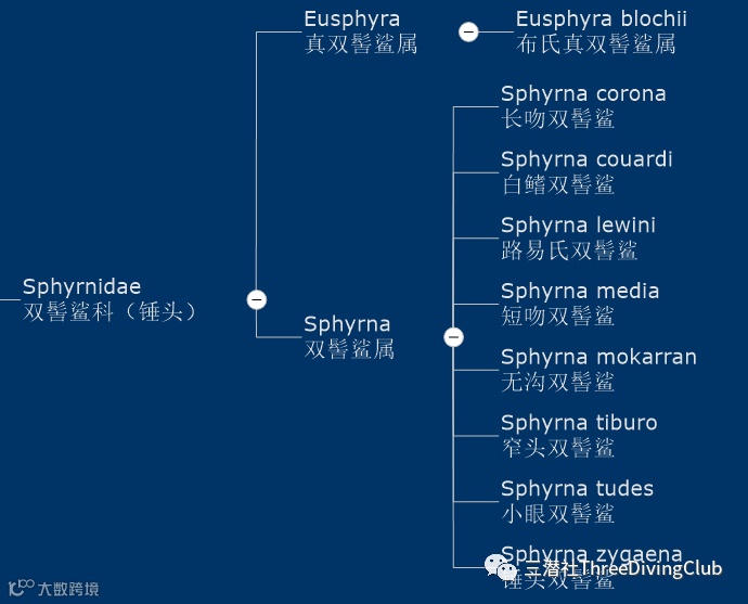 这科的命名实在是又贴切又含蓄,不服不行,科下分两属,其中一属真双髻鲨属(Eusphyra)仅一种布氏真双髻鲨(Eusphyra blochii),又叫定子双髻鲨。