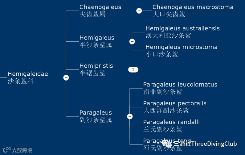 沙条鲨科(Hemigaleidae),下属尖齿鲨(Chaenogaleus)、半沙条鲨属(Hemigaleus)、半锯齿鲨(Hemipristis)、副沙条鲨属(Paragaleus)四属。