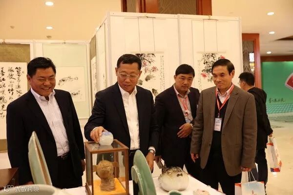 河豚鱼分会副会长、天正集团董事长孟雪松(左)陪同农业部渔业渔政管理局局长张显良(中)、副局长李书民(右)参观天正河鲀文创艺术展
