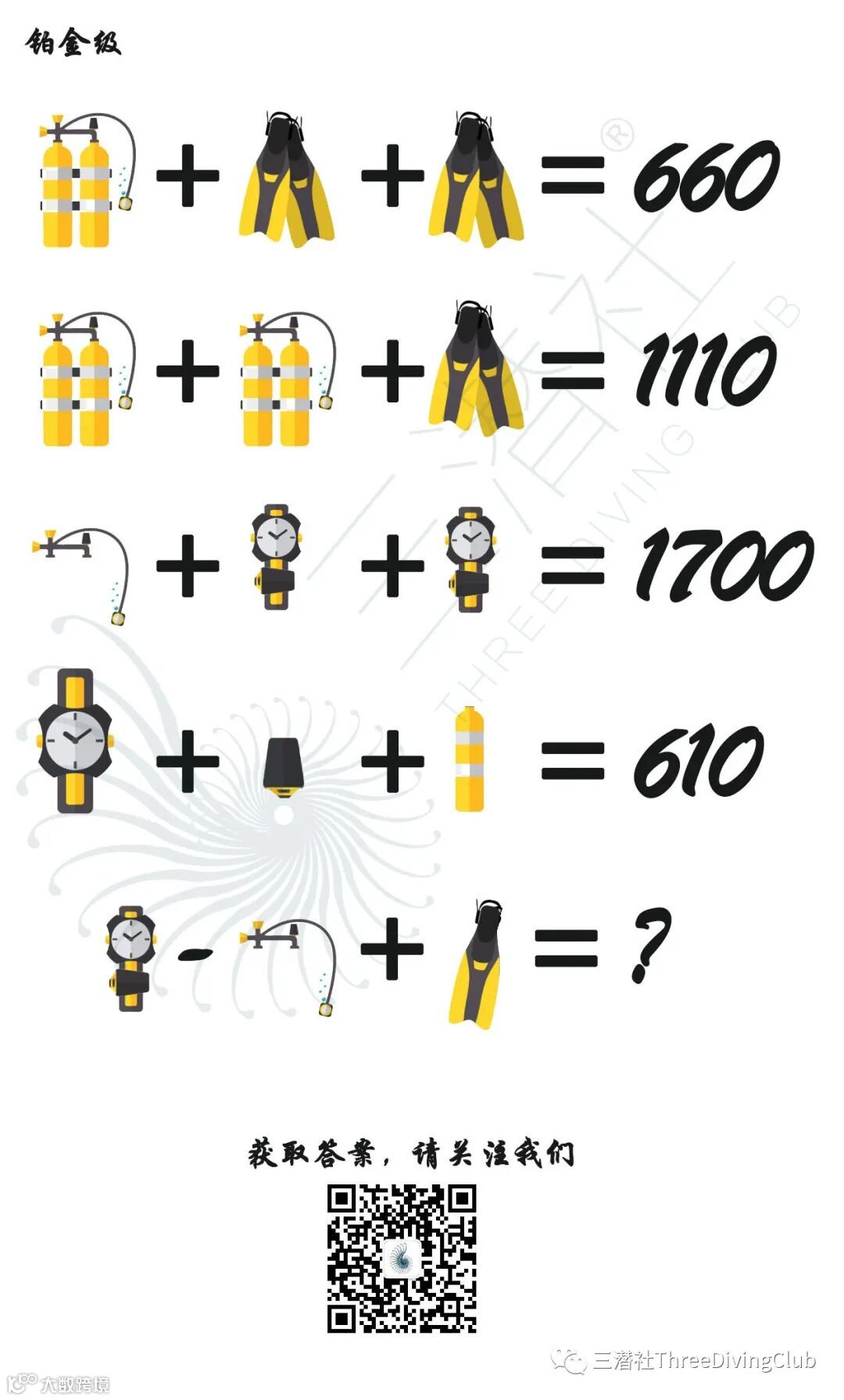 通过等式1和等式2组成的二元一次方程组容易得出,气瓶=520,脚蹼=70,还有一个隐藏信息,气瓶=双瓶+调节器=520