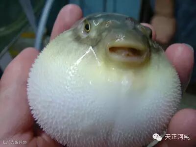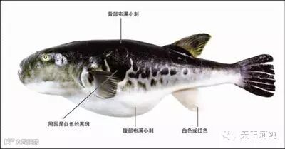 河豚鱼体形长、圆,头比较方、扁,有的有美丽的斑纹;有些则没有斑纹,而是一片黑色的鱼。又有形容河豚鱼外观呈菱形,眼睛内陷半露眼球,上下齿各有两个牙齿形似人牙。鳃小不明显,肚腹为黄白色,背腹有小白刺,鱼体光滑无鳞,呈黑黄色。河豚鱼口小头圆,背部黑褐色,腹部白色,大的长达1米,重10千克左右,眼睛平时是蓝绿色,还可以随着光线的变化自动变色。身上的骨头不多,’而且背鳍和腹鳍都很软,但长着两排利牙,能咬碎蛤蜊、牡蛎、海胆等带硬壳的食物。又有形容河豚鱼外观呈菱形,眼睛内陷半露眼球,上下齿各有两个牙齿形似人牙。鳃小不明显,肚腹为黄白色,背腹有小白刺,鱼体光滑无鳞,呈黑黄色。