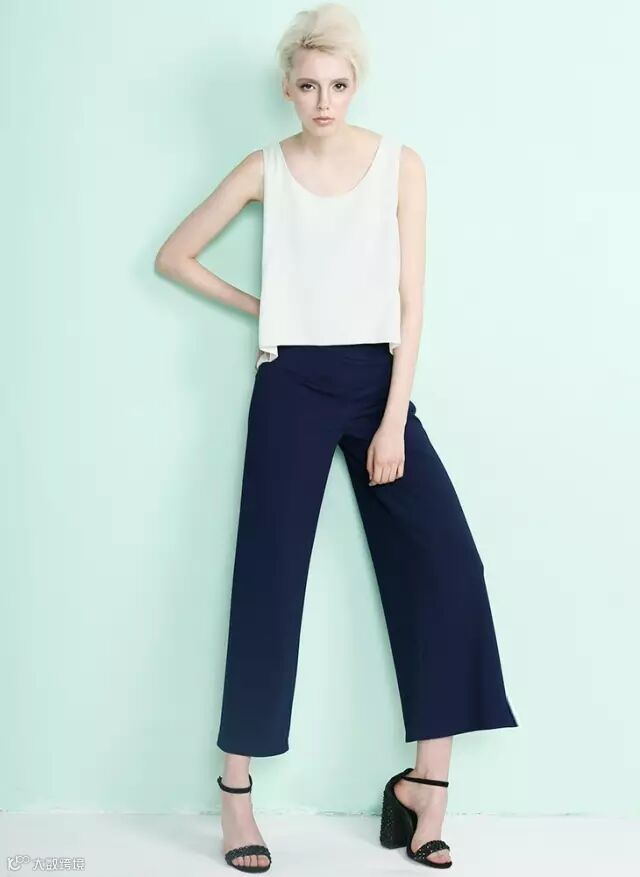 碎碎念:今年不知道为什么,阔腿裤超级火,不论冬天还是夏天,它都是必备款。上面这套搭配可以说的最简单清爽的一套搭配了,8分的阔腿裤再配一双黑色的高跟鞋,分分钟让你变成1米8。但是这套搭配最好胸小点的妹子穿呦,不然效果可能不会那么到位哦~