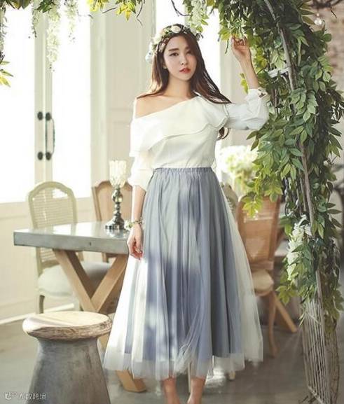 1、搭配Tips:露肩雪纺衫+百褶裙