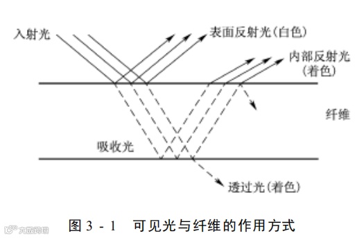 纤维可看成是半透明物体, 部分光可进入纤维内部, 在内部主要发生吸收、散射或发射荧光。吸收主要由染料和光发生互相作用, 即发生选择吸收, 互补光被漫反射或透过纤维, 使纤维呈现颜色, 未被吸收的光则在纤维内部发生散射, 部分光也透射出来。