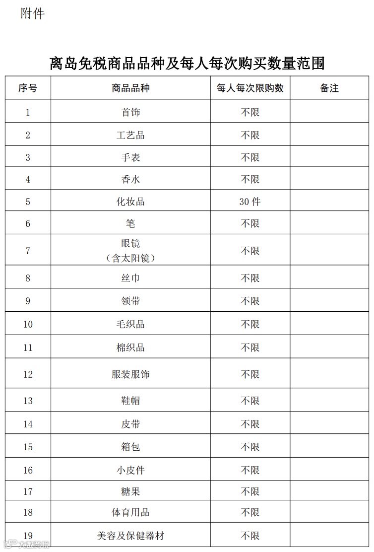 一、离岛免税政策是指对乘飞机、火车、轮船离岛(不包括离境)旅客实行限值、限量、限品种免进口税购物,在实施离岛免税政策的免税商店(以下称离岛免税店)内或经批准的网上销售窗口付款,在机场、火车站、港口码头指定区域提货离岛的税收优惠政策。离岛免税政策免税税种为关税、进口环节增值税和消费税。