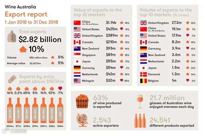 近日,澳洲酒管局Wine Australia发布2018年年度出口报告。