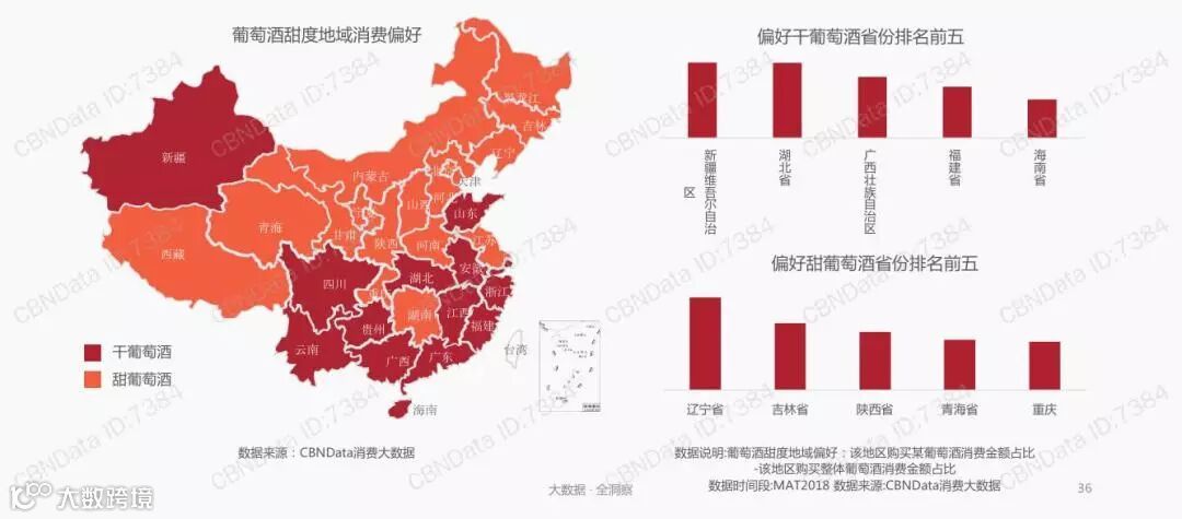 与私下认知中南方人更喜甜葡萄酒的印象相左,大数据显示北方省份更偏爱甜葡萄酒,其中辽宁、吉林、陕西、青海、重庆为喜爱甜葡萄酒的前五省份。