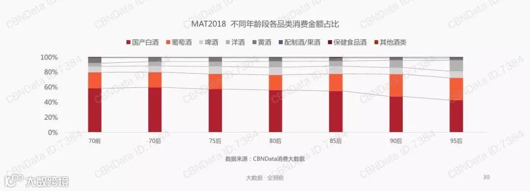 同70后、80后更倾向白葡萄酒的消费习惯相比,90后的酒水消费习惯更多元化,葡萄酒、洋酒的消费占比更高。