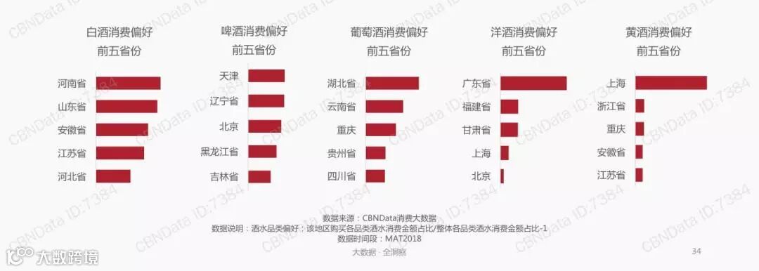线上酒类偏好具有明显的地域性,其中葡萄酒消费偏好前五的省份主要为中西部,分别是:湖北、云南、重庆、贵州省、四川省。