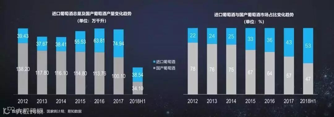 进口葡萄酒市场如火如荼,正在快速抢占国产葡萄酒市场份额。两者的强弱对比关系也在2018年发生了根本性转变:2018年进口葡萄酒总量占比首次超过国产葡萄酒总量占比。