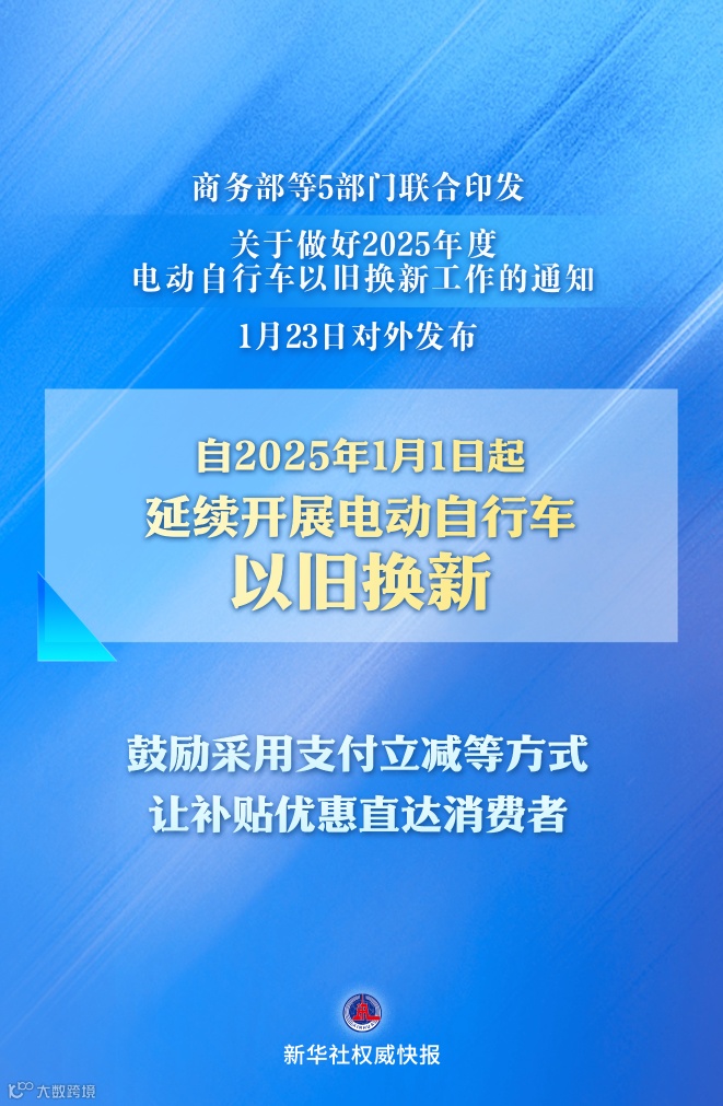 商务部等5部门联合印发《关于做好2025年度电动自行车以旧换新工作的通知》,1月23日对外发布,明确自2025年1月1日起,延续开展电动自行车以旧换新工作。