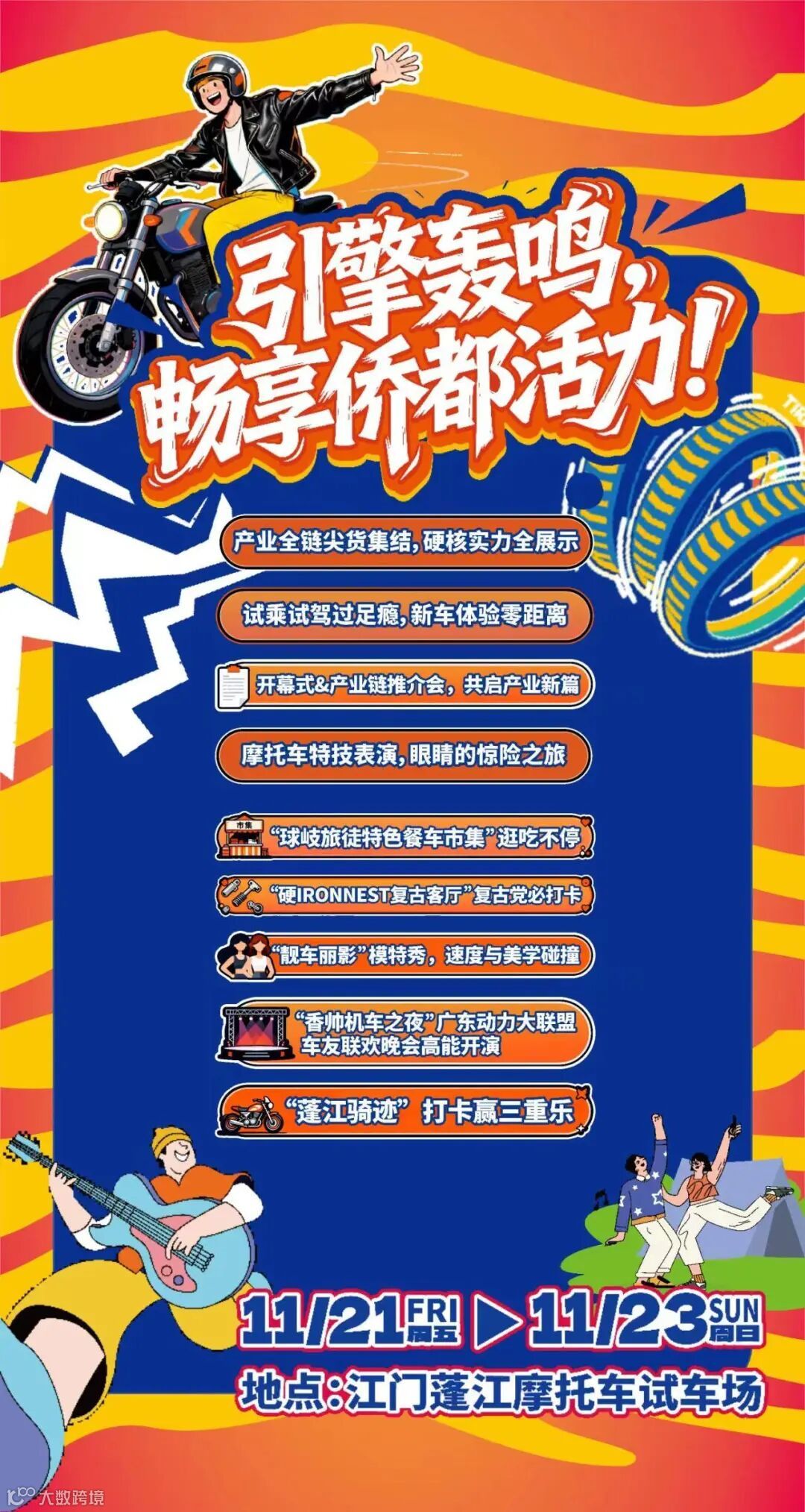 11月21日至23日,江门蓬江摩托车试车场,这场摩托盛会即将启幕。这里有35年坚守的骑行热爱,有打破偏见的女骑风采,有产业升级的硬核实力,更有传承创新的侨都文化。让我们一同赴约,见证两轮驰骋中的自由与热爱,感受江门摩托产业与骑行文化的双向赋能。
