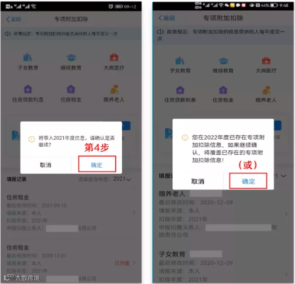 ② 依据提示“将带入2021年度信息,请确认是否继续?”或者“您在2022年度已存在专项附加扣除信息,如果继续确认,将覆盖已存在的专项附加扣除信息!”,确认后点击“确定”;如下图