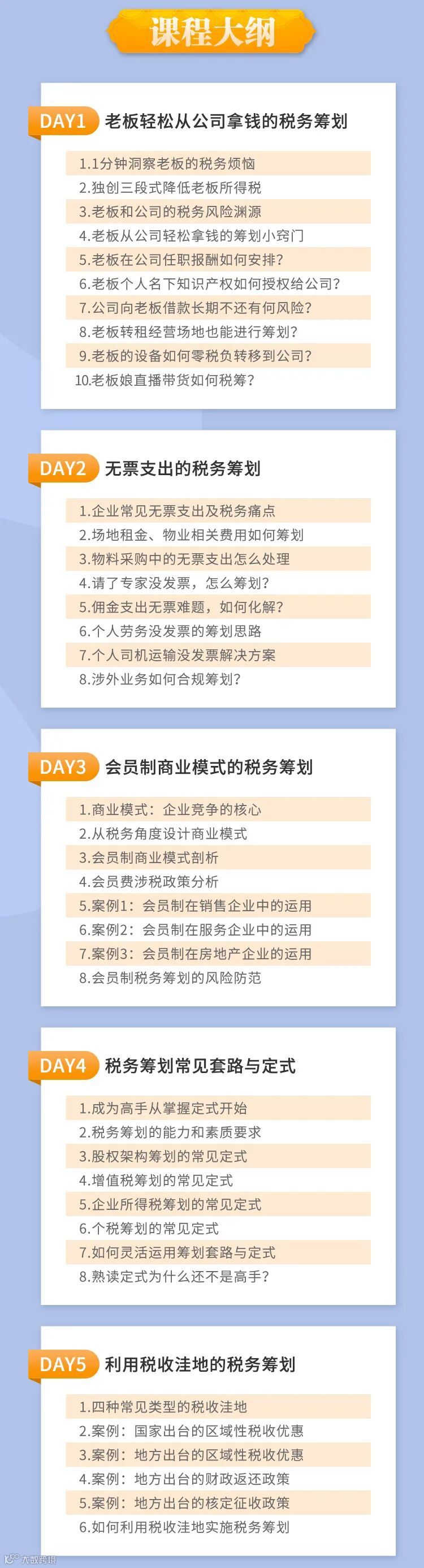 老板轻松从公司拿钱的税务筹划、无票支出的税筹办法、会员制商业模式的税务筹划、会员费涉税政策分析、税务筹划常见套路与定式、四大常见类型的税收洼地+经典案例、税务洼地实施税筹的方法。