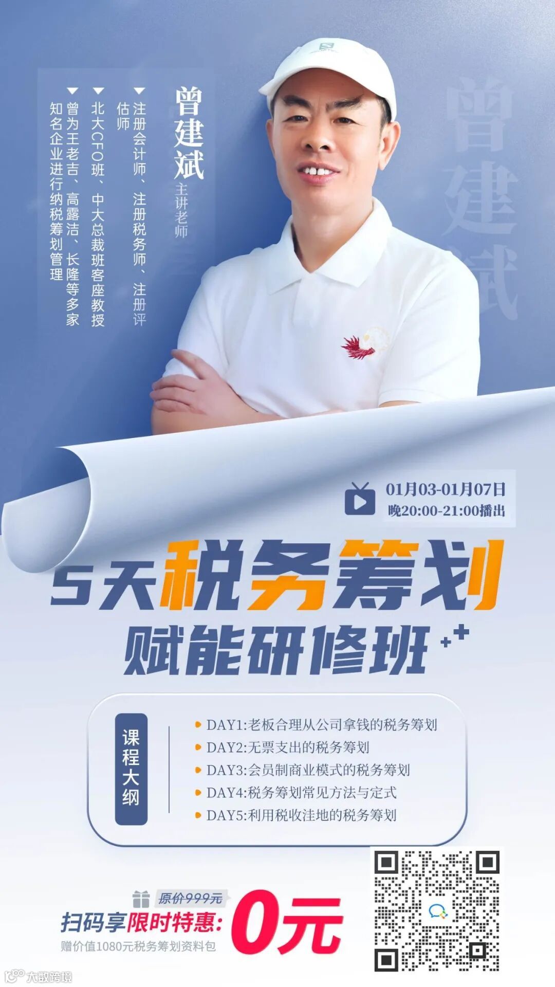 本次集训营,原价999元,今天在本公众号内,前500位学习名额仅需0元!扫码可领价值1080元的税务筹划全套资料包!