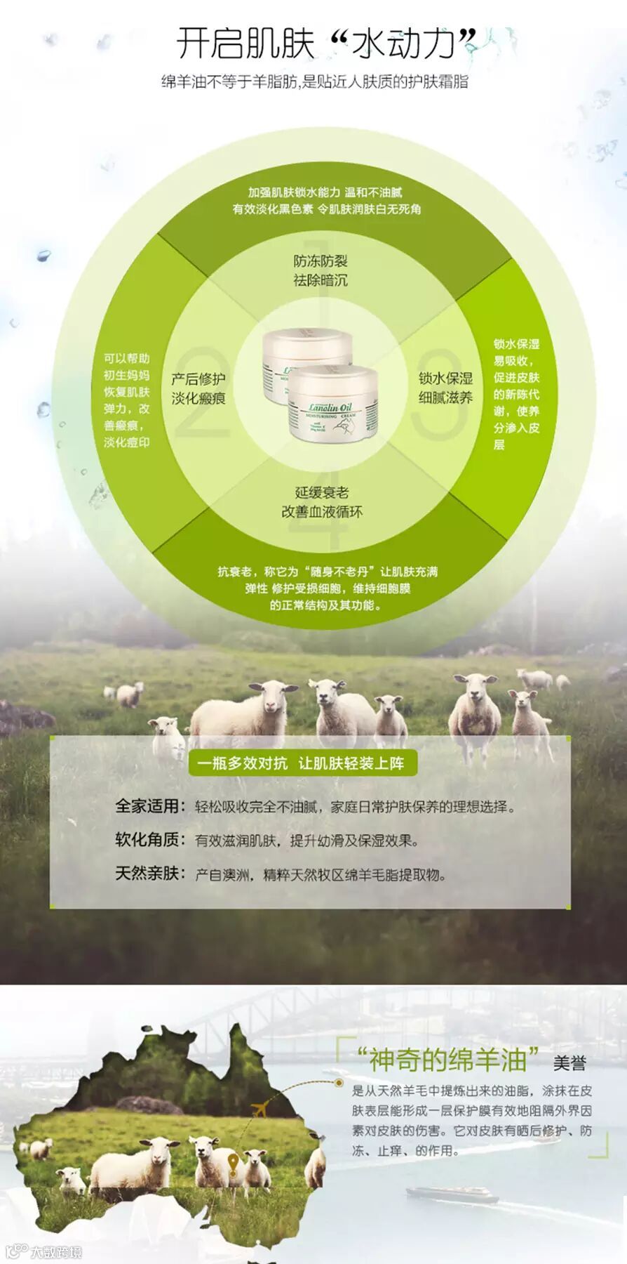 澳大利亚的美利诺绵羊举世闻名,羊毛产品更是满坑满谷。澳大利亚的绵羊油最大的特点就是“滋润但绝不油腻,吸收好,软滑细腻”。绵羊油具有很好的保湿及润肤效果,能有效预防秋冬季皮肤干燥。绵羊油虽是油脂,但一点都没有油腻感。