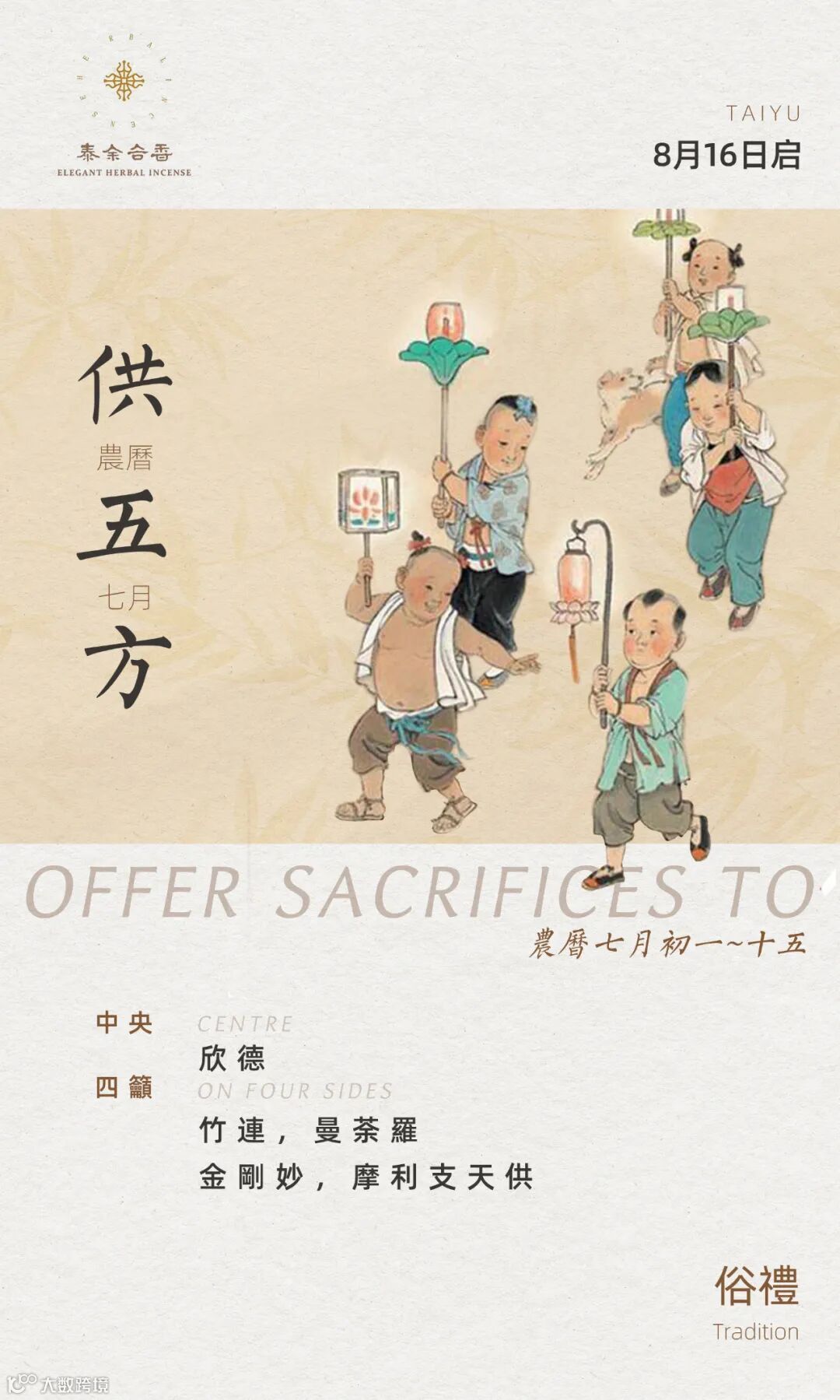 从农历七月初一起维持一个月的供五方是最合适的香供养。搭配窗台或者露台的燃香,俗礼上做到上供下施。