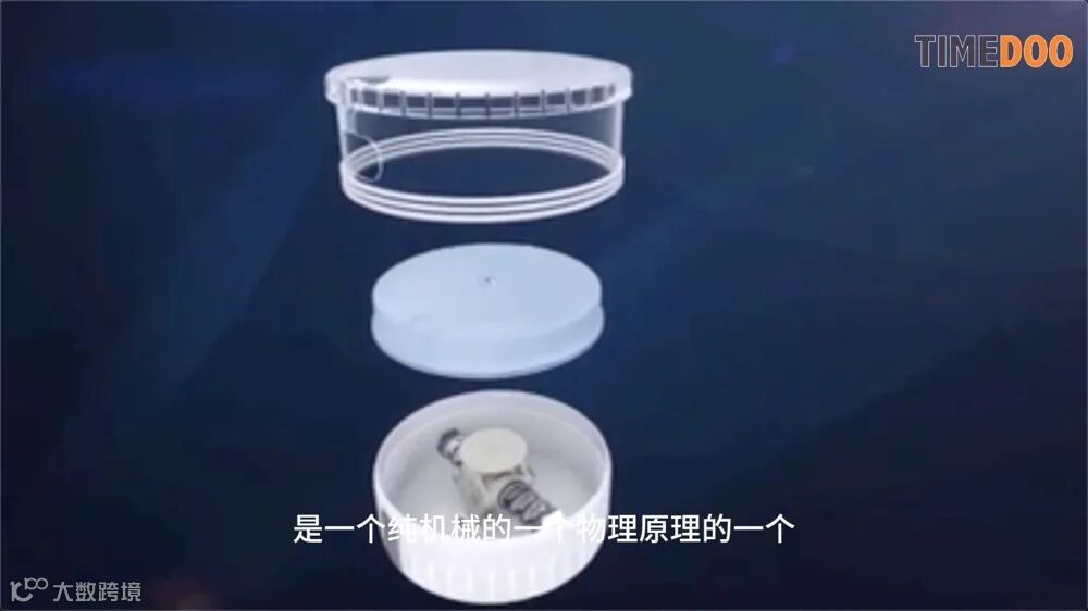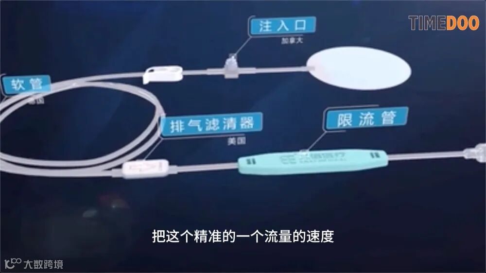 该产品主要由两部分组成。首先是动力来源,在可重复使用的泵体上,可以反复使用。其次是流量精确控制的亮点,设计在蓝色部分的耗材上。药液通过输液囊进入蓝色部分后,泵会自动将流速控制在标注的速度上,整个操作非常简单。