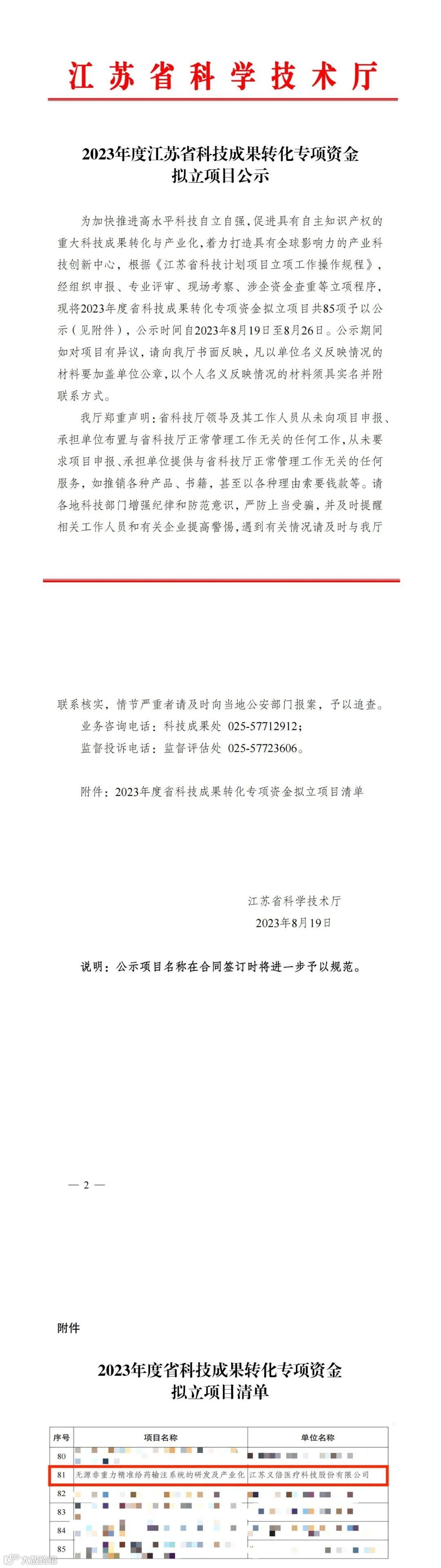 近日,江苏省科技厅公布了2023年度省科技成果转化专项资金拟立项目,江苏义倍医疗科技股份有限公司“无源非重力精准给药输注系统的研发及产业化”项目获批,8月26日通过公示后正式立项。