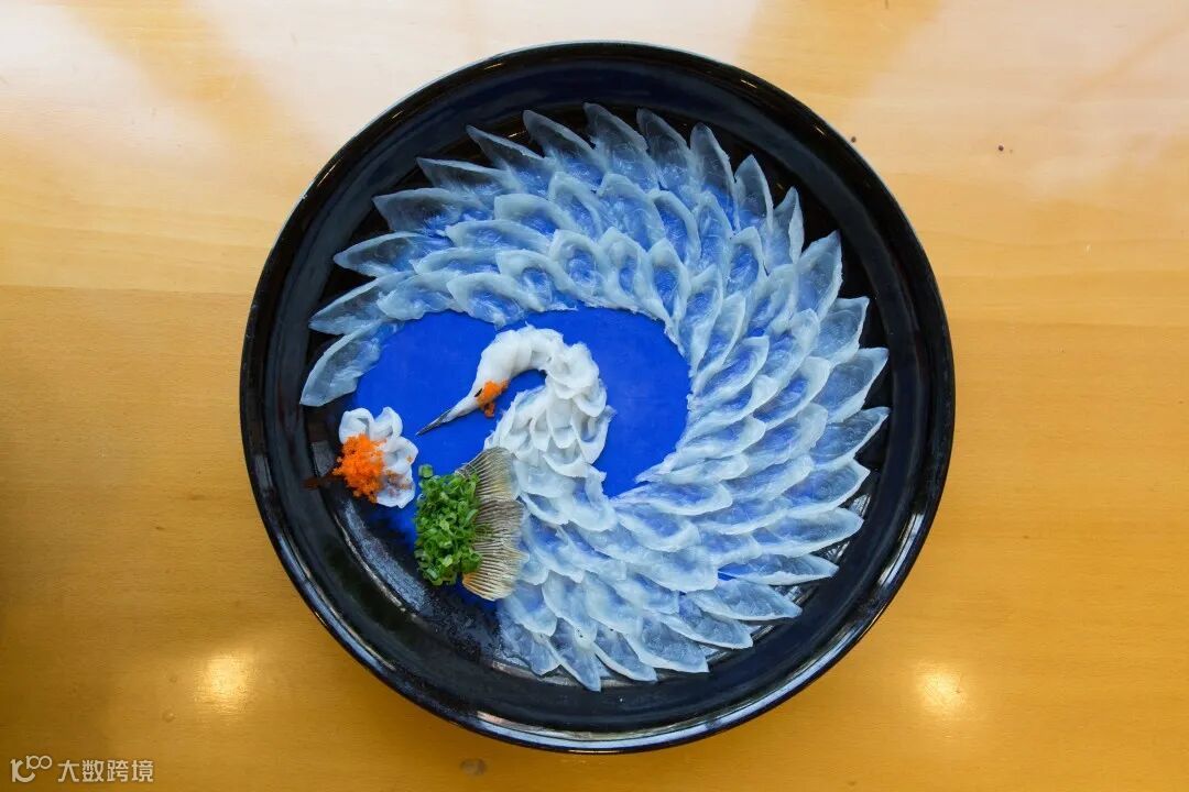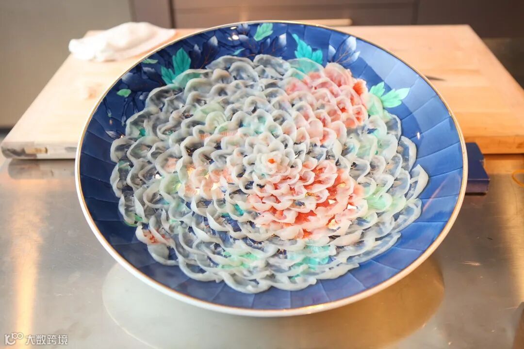 传统日料中,有很多经典的摆盘造型,Q弹的河豚鱼肉被切成晶莹剔透的薄片,吹弹可破却在手艺高超的师傅手中被摆成牡丹、白鹤、菊花等各种美丽的造型。