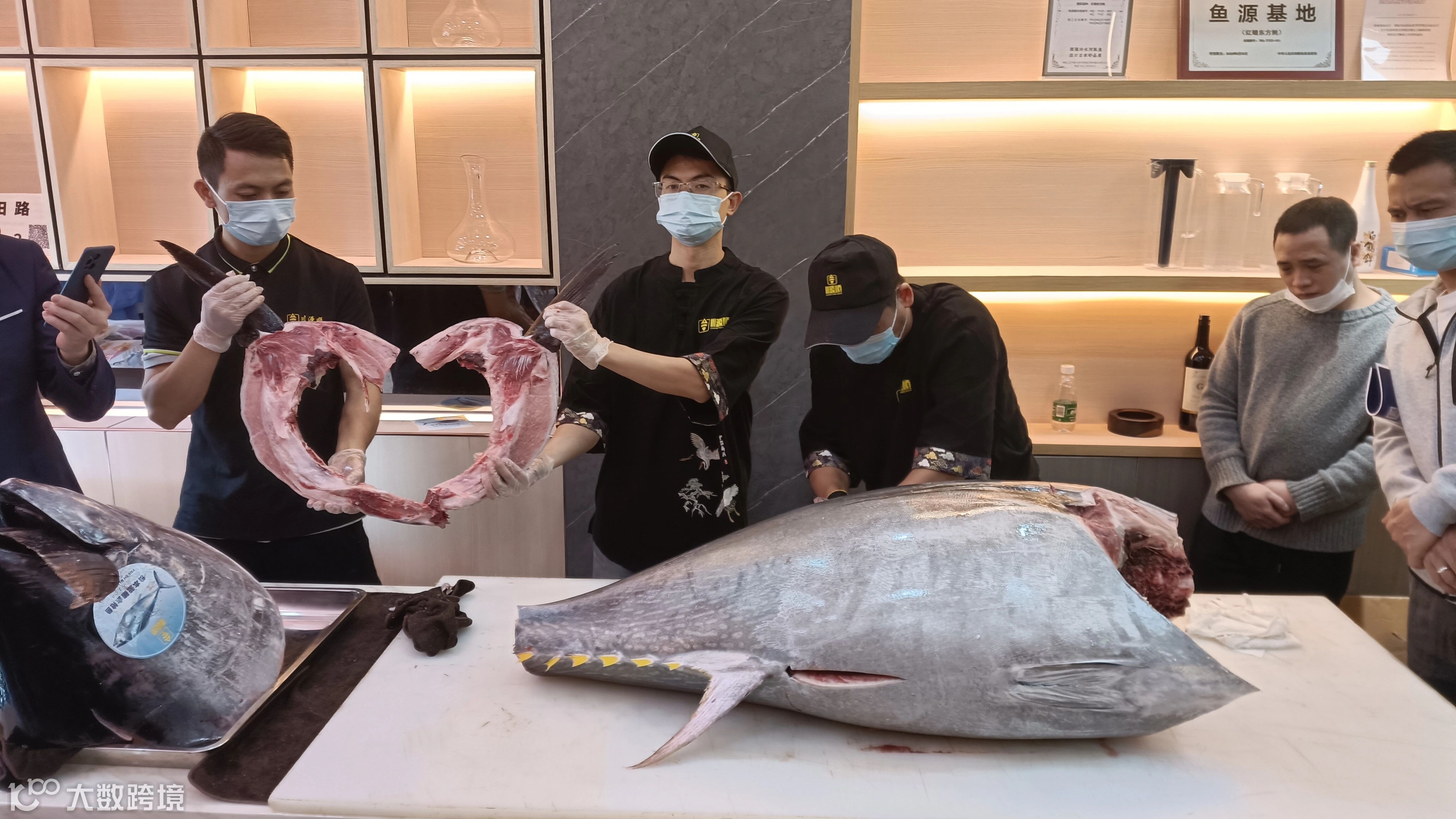 天正河豚北京料理店店长王成涛为嘉宾们开鱼和制作河豚鱼刺身等菜肴,除此之外本次推介会还有一条巨无霸蓝鳍金枪鱼。这样河豚鱼和金枪鱼双开的开鱼秀在深圳首次。