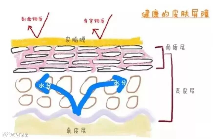 我们的皮肤是由表皮+真皮+皮下组织共同构成~而水分想要进入皮肤,首先必须进入表皮的最外层角质层!