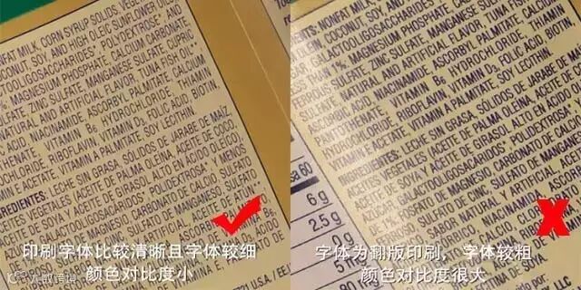 奶粉包装标签上的印刷文字应清晰,文字说明中产品和生产企业的信息要标注齐全;对于产品说明,无论是罐装还是袋装奶粉,包装上都会有配方、执行标准、适用对象、食用方法等必要的文字说明。