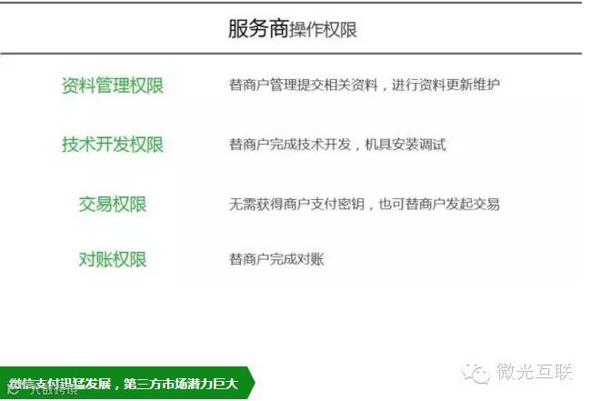 据悉,不仅申请过程简单无门槛,微信支付团队还为这些服务商提供了技术、商户接入、商户经营和智慧方案分享等多重能力,一并开放了资料管理、技术开发、交易、对账等五大重要权限。“微信上有大量的商家非常迫切地需要第三方给他们提供支持,微信也会持续不断地释放更核心的接口能力,”微信团队表示。